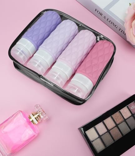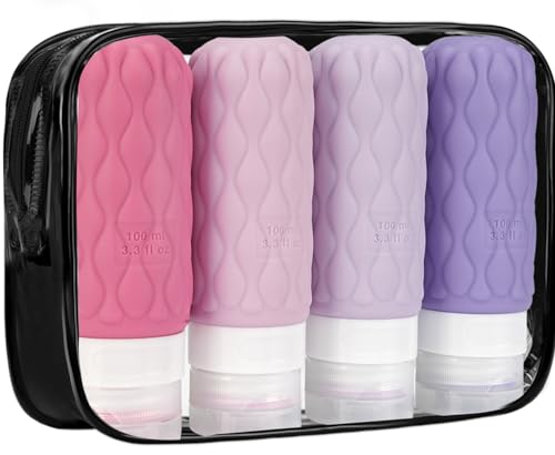 4 Pezzi Kit Bottiglie da Viaggio in Silicone con etichette, Set di Bottiglie da Viaggio 100 ml con Borsa da Toilette, Contenitori da Viaggio a Tenuta Stagna per Shampoo e Balsamo
