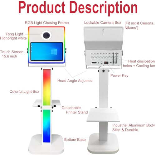 CARATTERISTICHE: 【Caratteristiche speciali】: la cabina fotografica a specchio magico è dotata di un touch screen da 15,6 pollici, telaio in metallo, luci di riempimento RGB e tecnologia touch capacitiva integrata con mini PC i5 8 GB 256 GB per fotocamere DSLR. Basta toccare lo schermo per scattare foto e condividerle online all’istante, che può anche essere stampato tramite stampanti collegate.