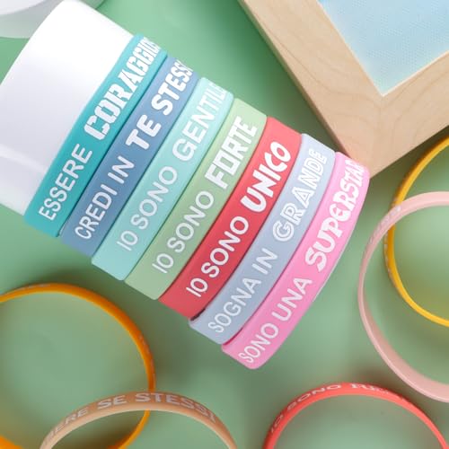 I braccialetti GEBETTER Silicone con Frasi Motivazionali Italiano sono un regalo unico e ispirato per le feste di compleanno, fine anno, fine anno scolastico o altre occasioni speciali. Sono realizzati con materiale di alta qualità, sono disponibili in una vasta gamma di colori e frasi motivazionali, e sono ideali per bambini di ogni età e per chiunque ami esprimere la propria personalità.