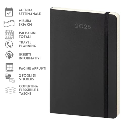 [ CARATTERISTICHE AGENDA 2026 ] Ogni agenda contiene 150 pagine, con un layout settimanale per una pianificazione dettagliata e organizzata di ogni giorno dell’anno con musura da 9X14 cm. Modello morbido comodo e pratico con planning mensile, travel planning, inserti informativi, pagine appunti a puntini e bianche e 2 fogli di stichers.
