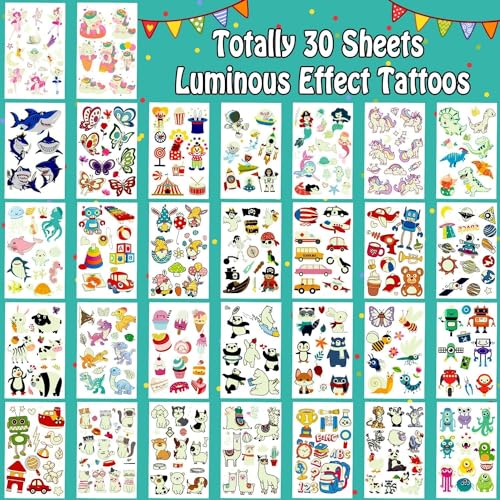 Tatuaggi finti luminosi: I bambini saranno attratti da quei simpatici tatuaggi luminosi! La caratteristica delle funzioni luminose ti farà essere unico nella folla. Suggerimenti: illuminando questi tatuaggi in anticipo per qualche minuto sotto la lampada o le luci del sole, il tatuaggio funzionerà meglio al buio.