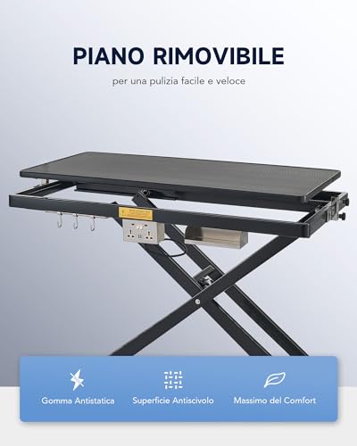 COSTRUITO PER RESISTERE IN MODO SICURO: Questo tavolo da toelettatura per cani è dotato di uno stabile sollevamento a X in acciaio, di una barra per toelettatura in acciaio inossidabile e di un piano in gomma rimovibile per sostenere fino a 110 kg. Migliora la tua efficienza utilizzando le prese integrate per un rapido accesso ad asciugacapelli o aspirapolvere.