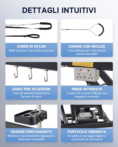 ORGANIZZAZIONE SEMPLIFICATA: Forniamo un pratico organizer per strumenti, un vassoio portaoggetti e 4 ganci per accessori per mantenere gli elementi essenziali per la toelettatura a portata di mano. Il cestino pieghevole garantisce una rapida pulizia dei peli, rendendo la pulizia post-toelettatura un gioco da ragazzi.