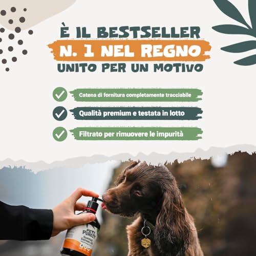 FATTO CON SOLO IL PUREST 100% OLIO DI SALMONE SCOZZESE NATURALE: A Pets Purest, amiamo i nostri amici a quattro zampe. Ecco perché facciamo solo i supplementi più puri per cani e gatti. Il nostro integratore di olio di salmone puro contiene ingredienti naturali ed è prodotto in Gran Bretagna.