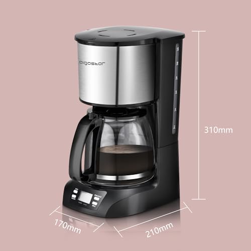 Aigostar Benno – Macchina da caffè americano e tè da 800 W con filtro riutilizzabile e piastra riscaldante, macchina caffe con mantenimento calore, capacità 1,5 L, timer 24 ore, sistema antigoccia