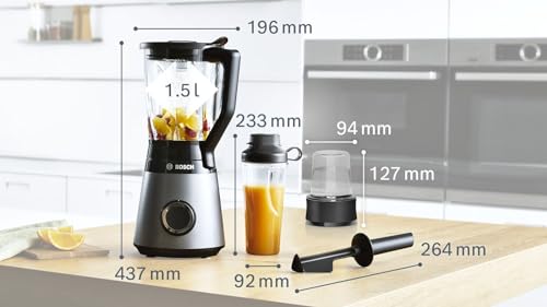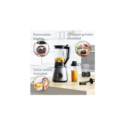 Bosch Elettrodomestici VitaPower MMB6177S – Frullatore con tritatutto, serie 4, 1200 W, 30.000 giri/min, bottiglia To-Go da 0,6 l, lame solide, contenitore da 1,5 l, vetro Thermosafe argento/nero