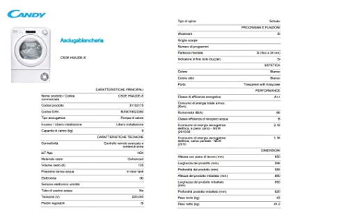 Candy Smart Pro CSOE H9A2DE-S Asciugatrice a Pompa di Calore, 9 Kg, Wi-Fi e BLE, Controllo da Remoto, Classe A ++, 59,6×58,5×85 cm, Bianco