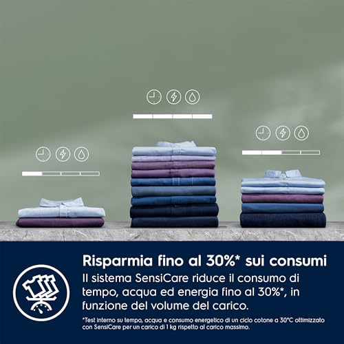 CARATTERISTICHE: TESSUTI DURATURI: Grazie alla tecnologia SensiCare System, i tuoi tessuti sembreranno nuovi per il doppio del tempo. Questo sistema regola automaticamente il ciclo in base al carico, garantendo un lavaggio delicato, sostenibile e una maggiore durata dei tuoi capi.