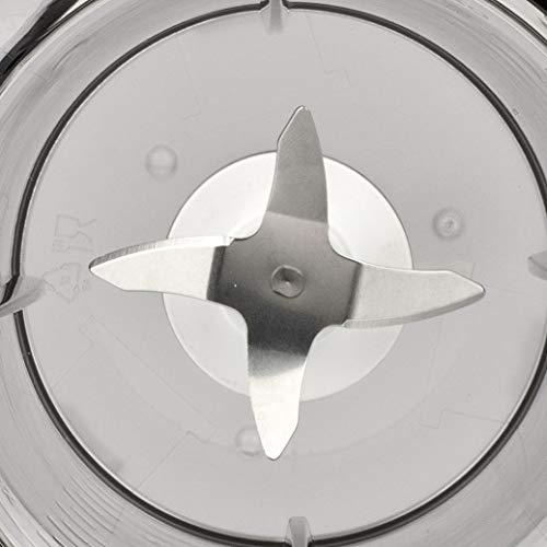 Le lame di questo frullatore sono in acciaio inossidabile, resistente, resiliente e facile da pulire. Inoltre, dispone di un tappo dosatore con cui è facile aggiungere qualunque ingrediente al frullato in produzione. L’apparato è fornito con un beccuccio per l’uscita del prodotto liquido e di una coppa plastica di 600ml.