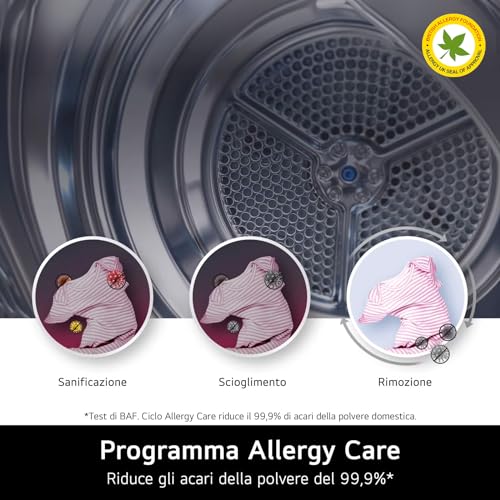 ALLERGY CARE: L’asciugatrice LG migliora la qualità della tua vita grazie al programma Allergy Care, che elimina il 99.9% degli acari della polvere responsabili di allergie o problemi respiratori