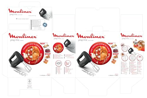 Moulinex PREP MIX Sbattitore Elettrico, Mixer 450W, 5 Velocità, Impostazione Turbo, 2 Fruste, 2 Ganci Impastatori, Acciaio Inox, Ergonomico, Accessori Lavabili in Lavastoviglie, HM450HF0