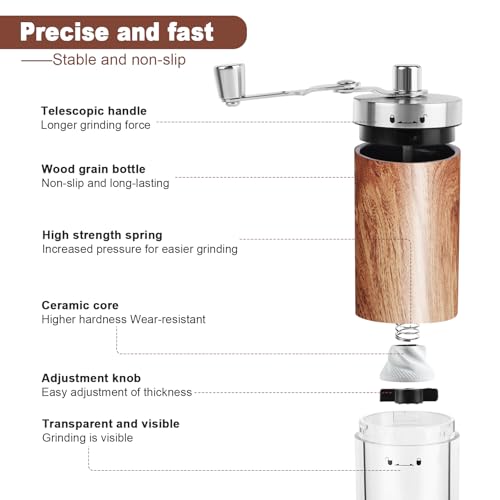 Portatile e facile da usare : L’intero macinacaffè può essere smontato senza attrezzi e pulito con una spazzola. Grazie alla forma compatta,peso leggero, è il compagno ideale per gli amanti del caffè a casa e durante le attività all’aperto come il campeggio e le escursioni.