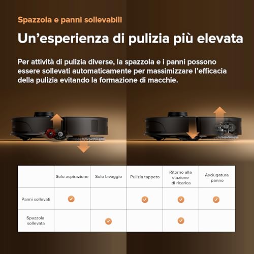 Un’esperienza di pulizia più elevata – Per attività di pulizia diverse, la spazzola e i panni possono essere sollevati automaticamente per massimizzare l’efficacia della pulizia evitando la formazione di macchie.
