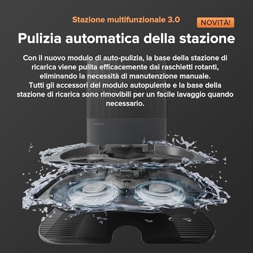 Pulizia automatica della stazione – Con il nuovo modulo di auto-pulizia, la base della stazione di ricarica viene pulita efficacemente dai raschietti rotanti, eliminando la necessità di manutenzione manuale. Tutti gli accessori del modulo autopulente e la base della stazione di ricarica sono rimovibili per un facile lavaggio quando necessario.