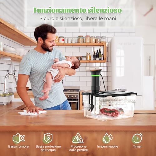 QUALITÀ E DURATA: il coperchio e l’elica in acciaio inossidabile del Cottura Bassa Temperatura possono essere sciacquati e puliti direttamente in acqua corrente. Nessuna preoccupazione per il guasto della Sous Vide causato dal vapore durante il funzionamento
