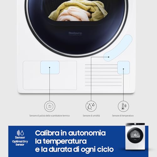 Samsung Asciugatrice Ai Control con Optimal Dry sensor DV90T5240AE/S3, 9 Kg, Pompa di Calore, Classe A+++, Wifi, Oblò reversibile,Carica Frontale, 60l x 85h x 60p cm