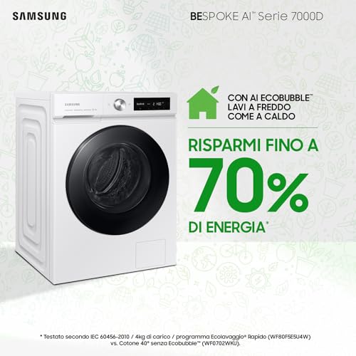 La carica frontale è progettata per un facile caricamento e scaricamento dei panni, mentre le dimensioni compatte (60 cm di larghezza, 85 cm di altezza e 60 cm di profondità) la rendono adatta anche a spazi ridotti. Esteticamente compatibile con la gamma Bespoke di Samsung, permette di abbinarla ad altri elettrodomestici per un look armonioso e moderno in cucina o in lavanderia.