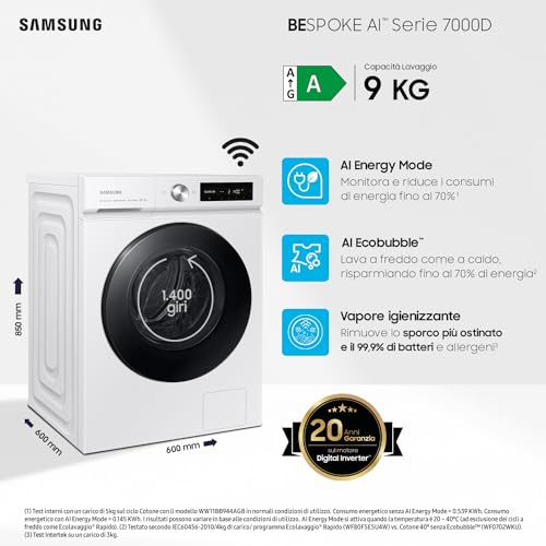 La Samsung Lavatrice Bespoke AI WW90DB7U34GW/U3 offre prestazioni eccellenti e una forte attenzione alla sostenibilità. Con la tecnologia AI Control, adatta ogni ciclo alle esigenze specifiche, ottimizzando acqua ed energia. La funzione EcoLavaggio Rapido 39′ è ideale per carichi leggeri, garantendo efficienza e risparmio, mentre il vapore aiuta a perdonare i vestiti delicati. La connessione WiFi consente il controllo remoto tramite app, rendendola molto pratica. La sua installazione semplice e il design robusto la rendono un’ottima scelta per chi cerca qualità e innovazione in una lavatrice.