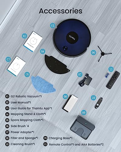 Servizio clienti professionale e una vasta gamma di accessori Thamtu ti offre una garanzia di un anno e un servizio clienti professionale. Il Thamtu G2 è inoltre dotato di una vasta gamma di accessori, tra cui una stazione di ricarica*1, una spazzola laterale*4, un porta scopa e un panno per la pulizia*1, un alimentatore*1, un manuale utente*1 e un’app Thamtu*1 manuale, un panno di ricambio per la scopa *1, un telecomando*1 e batterie*2, un filtro e un Amm*1.