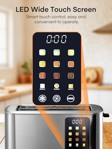 Tostapane 4 Fette, Fessura Ampia Tostapane, 9 Livelli di Doratura, con Controllo Touch Screen, Tostapane in Acciaio Inossidabile, con Vassoio Rimovibile, Annullamento/Scongelamento/Riscaldamento
