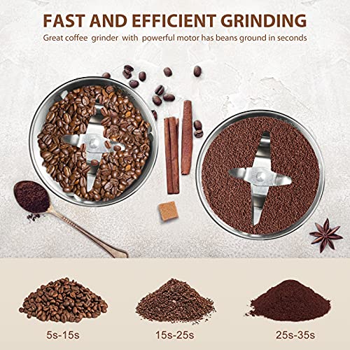 CARATTERISTICHE: Potenza 400w e multifunzionale: Questo macinacaffè elettrico di potenza 400w ha 3 fasi di macinazione (5s-15s, 15s-25s, 25s-35s). I chicchi di caffè ordinari hanno solo bisogno di macinare 20s-35s secondi. Il macinacaffè elettrico è solo macinare materiali disidratati (chicchi di caffè, vaniglia, ceci, noci, semi di lino, pepe, grani di pepe, cereali, noci, cereali, spezie, erbe, ecc)