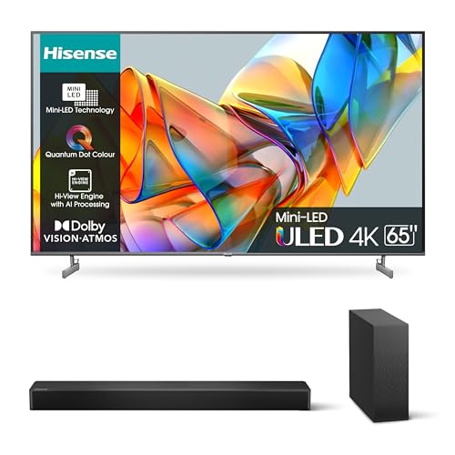 Hisense 65″ ULED Mini-LED 4K 2023 65U62KQ, Smart TV VIDAA U6, Dolby Vision, HDR 10+ 4K HS2100 Soundbar 2.1, 240W, Subwoofer Sottile Esterno wireless