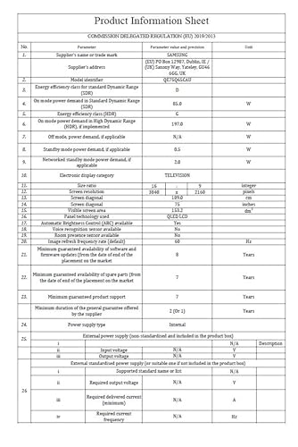 Contenuto: 1x Samsung Smart TV 75” Serie Q65C, QLED 4K UHD, Classe di efficienza energetica D, Include telecomando SolarCell, cavo di alimentazione e manuale di istruzioni, Dimensioni con base (LxAxP): 167,67 x 99,73 x 32 cm, Peso con base: 32 kg, Colore: Black