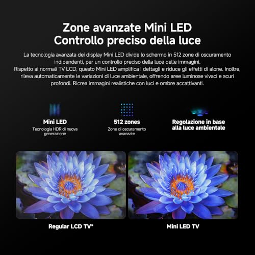 Tecnologia Mini LED avanzata: Goditi i film più oscuri e ricchi di dettagli, come le scene notturne di un film d’azione. Con la tecnologia Mini LED, il televisore regola le aree di illuminazione per creare neri profondi e luminosità intense. Guardando, ad esempio, un documentario sulla natura, noterai i riflessi nell’acqua e le ombre nella giungla, facendo sembrare ogni scena più realistica.