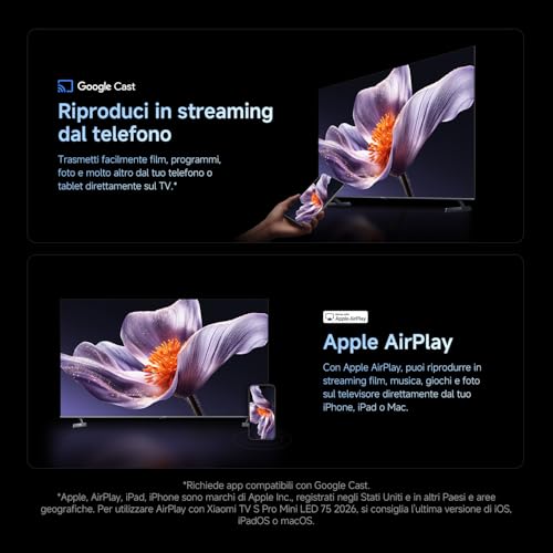 Xiaomi TV S Pro Mini LED 65 è una smart TV 4K di ultima generazione che combina tecnologia avanzata, prestazioni eccellenti e un design elegante. Questa TV è dotata di un pannello QLED che offre colori vividi, neri profondi e un contrasto eccezionale, garantendo un’esperienza visiva immacolata. La risoluzione 4K Ultra HD, insieme alla tecnologia HDR 10+, concede una qualità dell’immagine eccezionale, con dettagli definiti e una gamma di colori ampia. Il display è inoltre dotato di una frequenza di aggiornamento di 144Hz, che permette una scorrevolezza fluida dei movimenti, ideale per lo sport in diretta, le partite e i videogiochi. La smart TV è alimentata dal sistema operativo Google TV, che offre un’interfaccia intuitiva e un accesso rapido a mille app e servizi di streaming come Netflix, Disney+, YouTube, Spotify e molti altri. La presenza di Alexa integrata permette di controllare la TV con la voce, mentre l’intenzificazione Airplay2 facilita lo streaming di contenuti multimediali da dispositivi iOS. Grazie alla sua connettività avanzata, la TV dispone di dispositivi DVB-C, DVB-S, DVB-S2, DVB-T e DVB-T2, garantendo la ricezione dei principali segnali televisivi terra, satellite e via cavo. Sul lato audio, la TV si distingue per il sistema audio Harman AudioEFX, che offre un suono nitido e potente. Tecnologie avanzate come Dolby Vision, Dolby Atmos e DTS-X migliorano ulteriormente l’esperienza audiovisiva, trasportando l’utente in un suono immersivo a 360 gradi. La tecnologia ALEXA è inclusa nel TV, consentendo di controllare la TV con la voce, pleasant ottenere informazioni online, ascoltare musica, iniziare programma di streaming TV e altro. La tecnologia MEMC, detta anche moto compensazione artificiale, integra automaticamente i frame tra due fotogrammi suggeriti, migliorando i video.