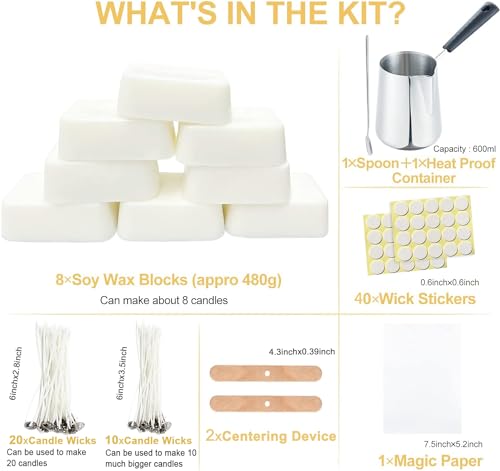 👍【Forniture Complete Kit per Realizzare Candele】Con 480g cera soia (8*cera soia, 1 blocco=60g=1 vasetti di candele), 600ml vasetto per versare, cucchiaio in acciaio inossidabile 304,30 stoppini candele(10 possono essere utilizzati per fare candele molto più grandi), 40 adesivi per stoppini per candele, 2 porta stoppini e carta magica. Un set completo di candele che piace sia agli adulti che ai bambini.La carta magica si abbina perfettamente alla candela accesa, rendendo la candela più creativa.