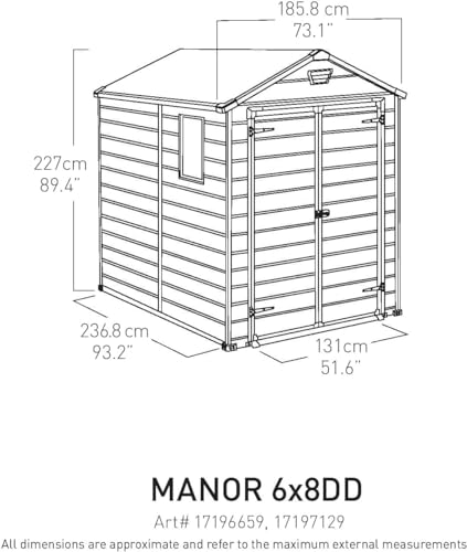 La Keter Casetta da giardino Manor ha dimensioni 6×8, che offrono un ampio spaziale utilizzabile. L’altezza della struttura misura 227 cm, mentre la larghezza e la profondità rispettivamente 185,8 cm e 236,8 cm, creando un’area interna adatta a ospitare attrezzi, mobilio da esterno o oggetti di vario uso.