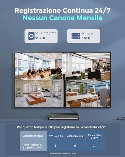 Il kit è dotato di audio bidirezionale, che consente di ascoltare e parlare attraverso le telecamere. Inoltre, il sistema è espandibile a 16TB, consentendo di aggiungere ulteriori telecamere se necessario.