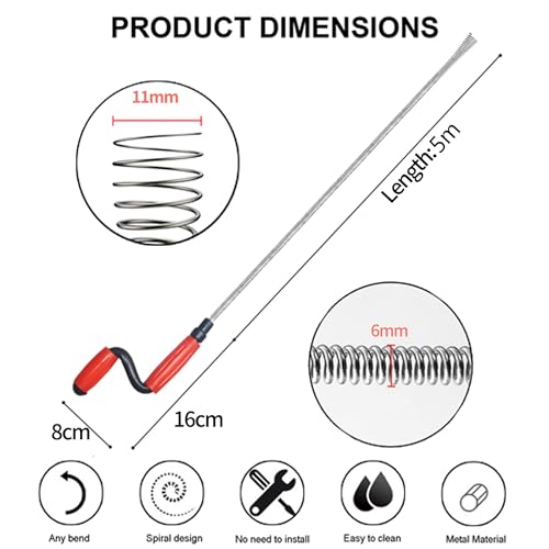 CARATTERISTICHE: 【 Ingrandisci Dimensione 】: Lunghezza: 5 m, diametro: 6 mm, il che significa che può essere inserito nella maggior parte dei tubi ostruiti. Lo Molla Sturatubi è realizzato in metallo. Il filo metallico consente alla pulizia del tubo di scarico di lavorare più a lungo senza arrugginire.