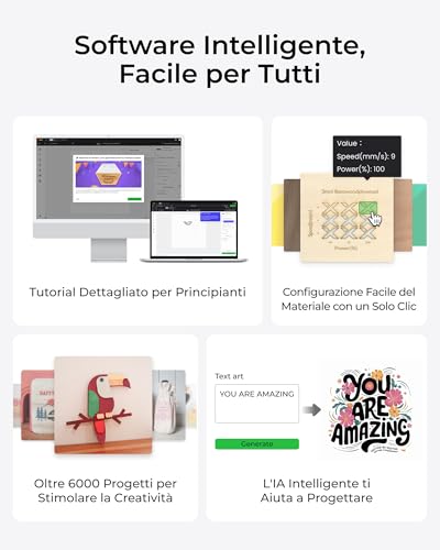 – Sicura, Facile da Usare e Pronta all’Uso: M1 Ultra Incisore laser è una macchina per incisione laser Classe 1 preassemblata, sicura per l’uso domestico. Arriva pronta per l’uso, senza bisogno di installazione. Compatibile con il software xTool XCS, include oltre 6000 progetti, immagini generate da IA, design personalizzati e funzionalità di modifica vettoriale. Tutorial disponibili per iniziare facilmente, rendendo M1 Ultra uno strumento indispensabile per hobbisti e professionisti