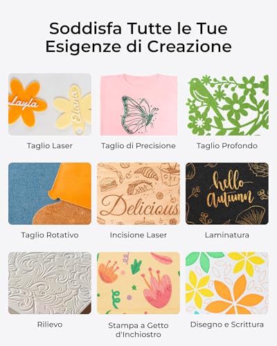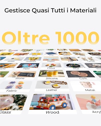 – Creatività Illimitata su 1000+ Materiali: xTool M1 Ultra taglio laser offre versatilità senza pari, lavorando con materiali morbidi e duri, sottili e spessi, superfici piane e curve 3D. È in grado di gestire oltre 1000 materiali diversi, tra cui vinile, cartoncino, legno e molto altro. Che tu stia creando T-shirt personalizzate, regali, decorazioni per feste o biglietti personalizzati, questa macchina ti permette di sperimentare e innovare con la massima convenienza