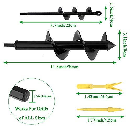 La confezione include – Due diverse dimensioni di punte elicoidali per soddisfare le diverse esigenze: la punta grande è adatta per scavare fori grandi e profondi (30 x 8 cm), un’altra punta piccola per fori piccoli e poco profondi (22 x 4 cm ). Con un paio di guanti da giardino.