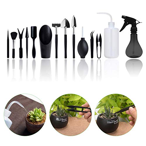 15 pezzi di strumenti per piante succulente includono: 1 annaffiatoio, 1 spazzola per la pulizia, 1 paio di pinzette a punta curva, 1 paio di pinzette a punta dritta, 1 tagliafoglie, 1 soffiatore ad aria, 2 strumenti per trapianto, 2 set di pala per secchio, 3 rastrelli pala vanga, 1 flacone spray, 1 tappetino per rinvaso delle piante (29,5 x 29,5 pollici)