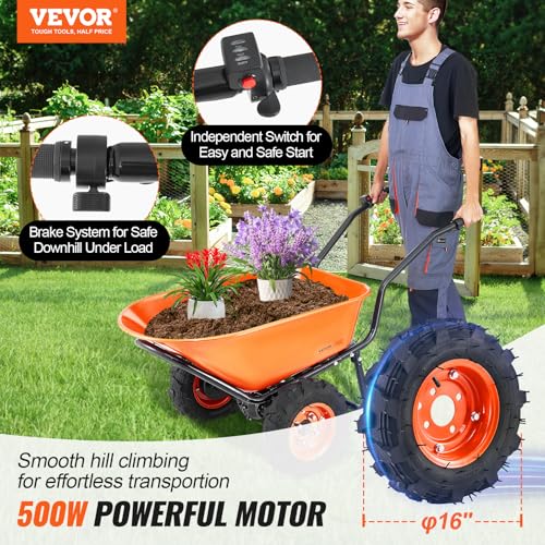 VEVOR Carriola Elettrica Carrello da Giardino Motorizzato 2 Ruote 500 W Ruota Larghezza 40 cm Carico 260 kg, Carrello Multiuso a Caricamento Facile per Fattoria, Prato, Giardinaggio, Magazzino