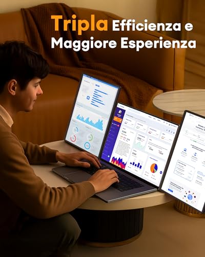 Grazie al suo design triplo, è possibile utilizzare il monitor come estensione dello schermo principale, consentendo un maggiore multifunzionalità e comfort durante le attività lavorative o di intrattenimento. Leggero e compatto, è facile da trasportare e adattarsi a diverse situazioni, che si tratti di viaggi di lavoro, riunioni in ufficio o momenti di relax a casa. Inoltre, la luminosità durante l’uso e gli angoli di visione perfetti rendono il display comodo per lunghi periodi di lavoro o per ufficio.