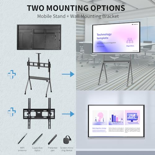 Lavagna interattiva intelligente: progettata con doppio sistema operativo Android 11 e Windows 10, che può essere cambiato a seconda delle necessità. La configurazione Android è RAM 4GB + ROM 32GB, mentre Windows è Core i7, RAM 8GB + SSD 512GB, include supporto mobile e staffa per il montaggio a parete.