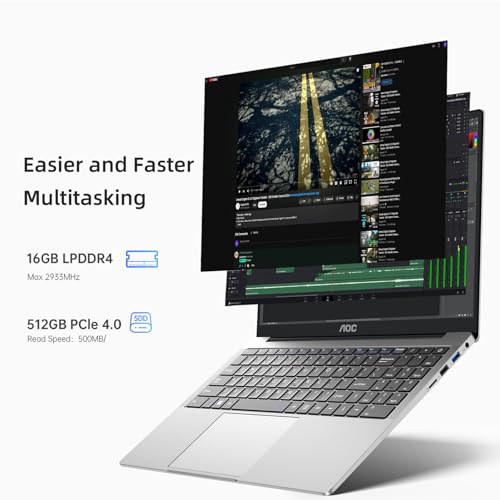 AOC PC Portatile, 12ª N97 CPU(Up to 3,6GHz), Gaming Notebook 16GB DDR4 RAM 512GB SSD Laptop, 15.6 Pollice FHD Schermo, 5G WiFi/BT5.1, USB3.2, HDMI Notebook, Tipo-C,Espandi a 2TB PC Portatili