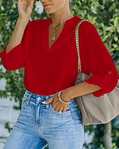 NONSAR Camicetta da donna Henley, elegante, con scollo a V, maniche arrotolabili, in stile casual, Colore: rosso, XL