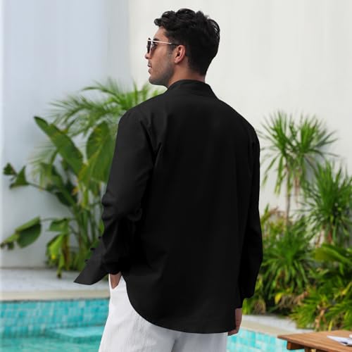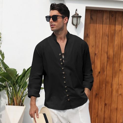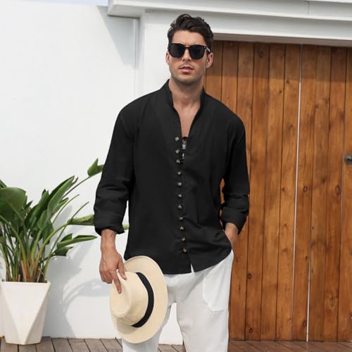Puimentiua Camicia Lino Uomo Camicia Estiva Leggera Maniche Lunghe Uomo Camicia Henley Spiaggia con Colletto Rialzato, Nero, XXL