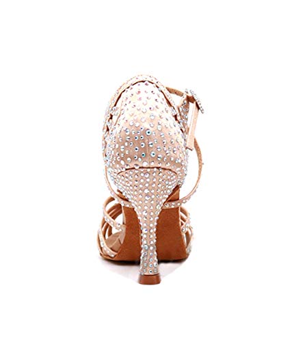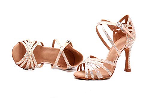 MGM-Joymod Sandali da ballo, da donna, aperti in punta, con cinturini incrociati e strass, ideali per feste, matrimoni, balli latini, moderni e tango, Beige (Pelle 9 centimetri Tacco), 38 EU