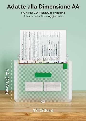 ABC life A4 – Raccoglitore di carta amministrativa, con 12 scomparti, formato A4, con motivo a griglia, portatile, organizer per cartelle di file, colore: Verde/Verde