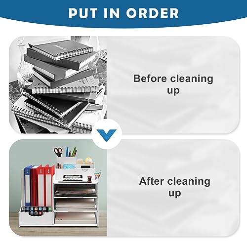 【Archiviazione file desktop】 Adotta un design in 2 parti: in una parte di questo organizer da scrivania è possibile archiviare documenti, file e cartelle, mentre nell’altra parte è possibile collocare i piccoli accessori quotidiani, ad esempio penne, gomme e nastro adesivo, ecc.