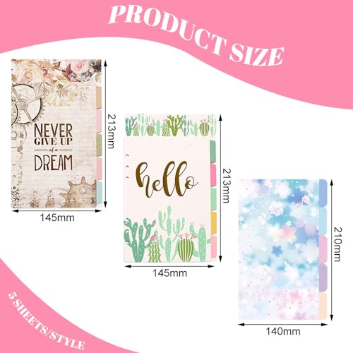 CARATTERISTICHE: Pacchetto incluso — Riceverete 3 set di divisori per raccoglitori, per un totale di 17 fogli, ciascuno con un motivo diverso. Questi divisori sono adatti per raccoglitori A5 (140 x 210 mm) a 6 fori.