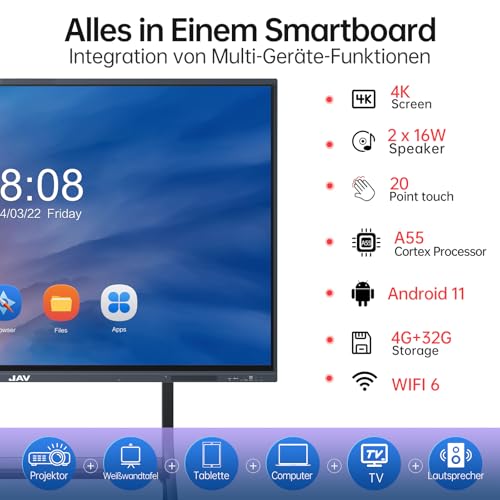 CARATTERISTICHE: 【Dual System Smart Board & Buona integrazione di hardware e software】 La lavagna interattiva JAV è integrata con sistema operativo Android e Windows OS. L’avanzato sistema operativo Android (Android 11.0, 4 GB di RAM + 32 GB ROM) è come uno smartphone, il robusto sistema operativo Windows (Windows 11.0, i computer OPS sono supportati, ma non sono inclusi) rende JAV Smart Whiteboard di fronte ad altri concorrenti. La lavagna digitale può funzionare in modo fluido ed efficiente con eccellente hardware Cortex-A55 *4 CPU. *Nota: il supporto per smart board non è incluso, si prega di fare clic sul nostro negozio per acquistarlo separatamente.