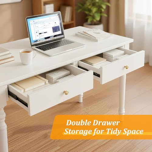 CARATTERISTICHE: Legno massello e durevolezza: realizzata in legno massello di alta qualità, con gambe in stile romano e telaio rinforzato, questa scrivania offre stabilità e durevolezza eccezionali, perfetta for l’uso quotidiano in ufficio o nello studio. Ampia scrivania, cassetti portaoggetti, facile montaggio ed estetica decorativa.