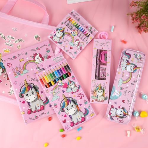 OFFCUP Set Di Cancelleria per Unicorno, Cancelleria per Regalo Bambina, Regalo Di Compleanno per Bambini, Include Astuccio, Matita, Matita Colorata, Pastello, Gomma, Temperamatite e Taccuino